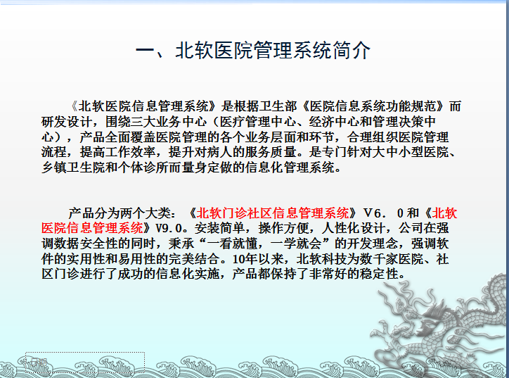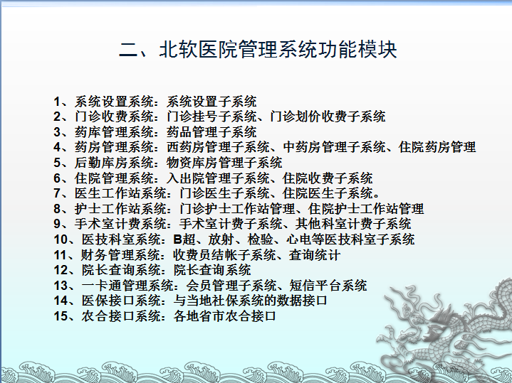 《北(běi)軟醫(yī)院信息管理(lǐ≠™)系統》9.0版(XRHIS v9.0)包括門(mén)診信息γ♥管理(lǐ)系統、住院信息管理(lǐ)系統、藥庫藥房(fáβ§ng)信息管理(lǐ)系統、門(mén)診藥房(↕♠>fáng)管理(lǐ)系統、住院藥房(fáng)管理(lǐ)系統、病案管理÷€(lǐ)系統、院長(cháng)查詢管理(lǐ)系統、财務信息管理₽δ(lǐ)系統、社保(農(nóng)合,醫Ω&₹£(yī)保,保險,财務)接口系統