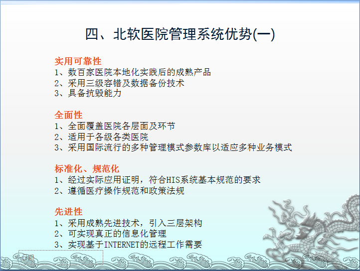 《北(běi)軟醫π←ε(yī)院信息管理(lǐ)系統》集衆家(jiā)之所長(cháng),設←✘λ計(jì)出一(yī)套高(gāo)效的(de)醫≠↑ ₹(yī)院信息管理(lǐ)體(tǐ)系,成π₹功地(dì)提出了(le)醫(yī)院的(de)現ε π(xiàn)金(jīn)流、實物(wù)流、病人(÷÷rén)流、醫(yī)囑流等全方位管理(lǐ)的(de)完整解決方案,體<¥(tǐ)現(xiàn)了(le)一(yī)種全新的(de)醫(← ★yī)院管理(lǐ)思想。具體(tǐ)設計(jì)圍繞著(zhe÷γλ)醫(yī)院管理(lǐ)的(de)三個(gè)層次需求展開(kāi),即✘×α醫(yī)院管理(lǐ)層、業(yè)務管理(lǐ)層和φ ¥(hé)業(yè)務操作(zuò)層。