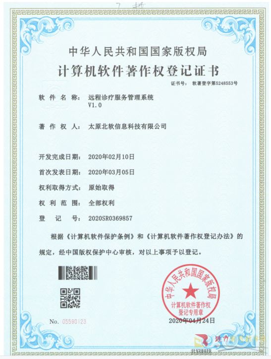 熱(rè)烈祝賀公司獲得(de)《遠(yuǎn)程診療服務管理(↑"lǐ)系統》軟件(jiàn)著作(zuò)權!