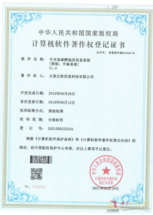 熱(rè)烈祝賀公司獲得(de)《手術(shù)室麻醉臨床信息系統》軟件→φ¥(jiàn)著作(zuò)權!