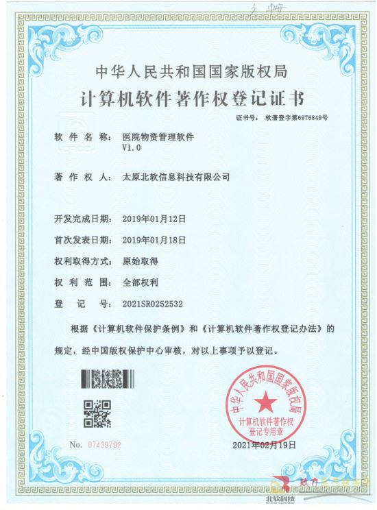 熱(rè)烈祝賀公司獲得(de)《醫(yī)院物(wù)資管理(lǐ)軟件(₩®jiàn)》軟件(jiàn)著作(zuò)權!